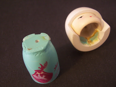 A primeira figura tinha problemas com limpeza e negligencia. Este caso foi uma queda que acabou por partir o braço da figurinha mais pequena a que estava associada.