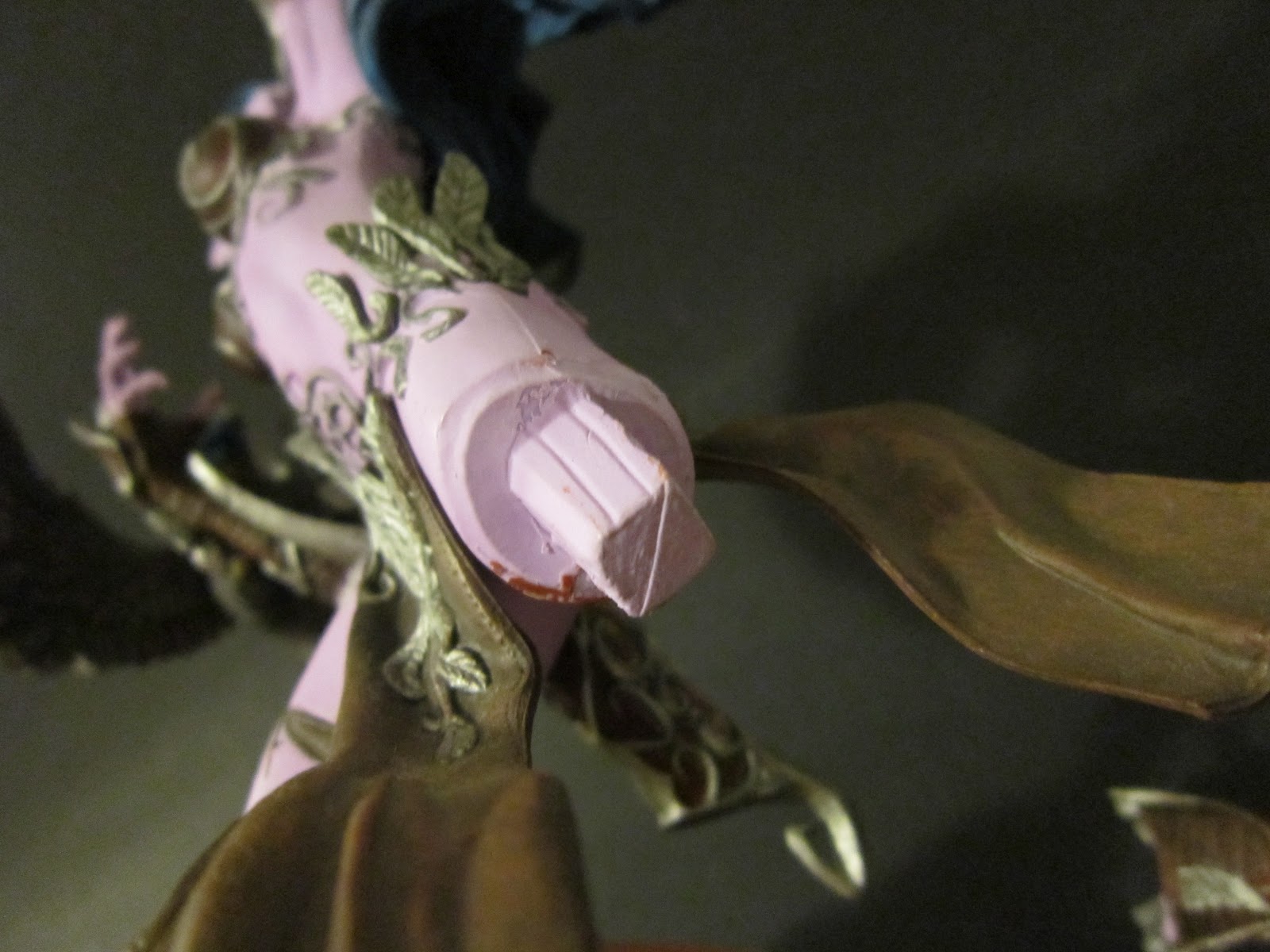 Este Skeletor apresentava um defeito numa perna que tornava a sua exposição inestética. Analisada a "ferida" chegou-se à conclusão que foi fruto de uma raspadela, ou seja faltava ali um pedaço de material!