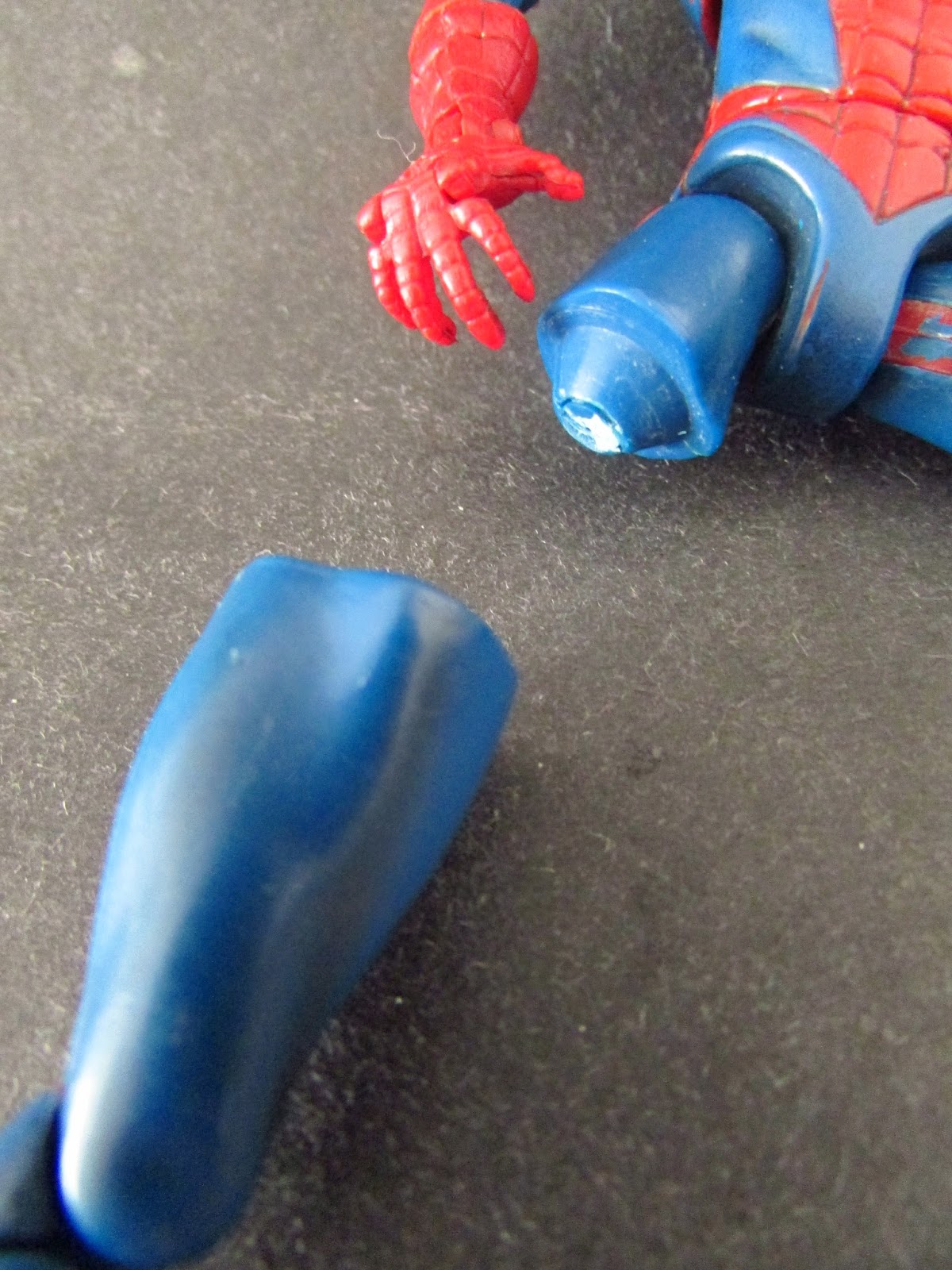 No caso deste Homem Aranha, a articulação giratória de uma das pernas partiu-se, provavelmente devido a stress na utilização da mesma.